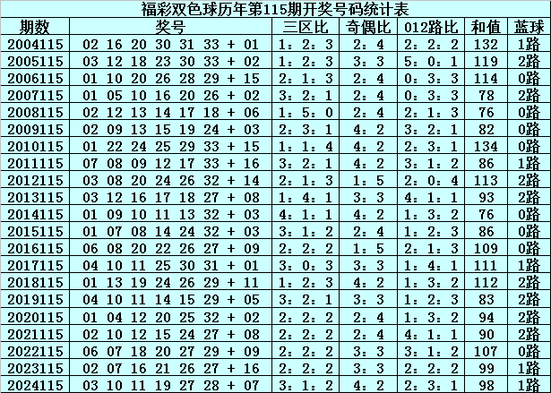 在第115期历史同期奖号中,红球三区分布总比例为44:40:42,奇偶总比例为58:68,012路比为42:41:43,和值分布在76-134之间,蓝球号码012路总比例为8:5:8。