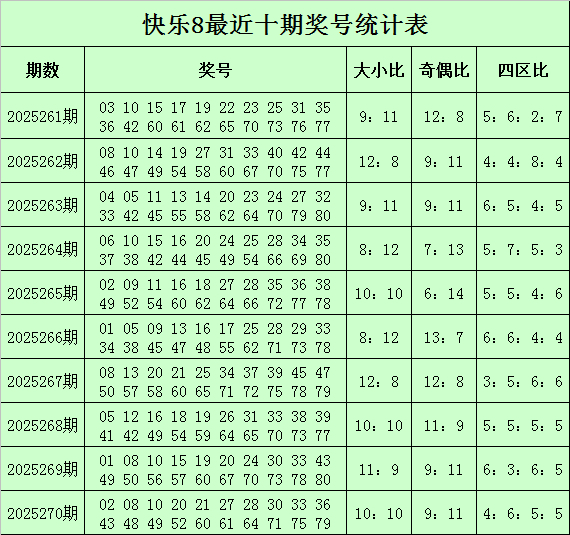 福彩快乐8第2025270期开奖回顾:02 08 10 20 21 27 28 30 33 36 43 48 49 52 60 61 64 71 75 79,其中奖号四区比为4:6:5:5,奇偶比为9:11,大小比为10:10。