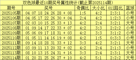 双色球第2025114期开奖号码:01 20 21 25 26 27 + 10。红球大小比为5:1,奇偶比为4:2,012路比为2:2:2,蓝球为大号。