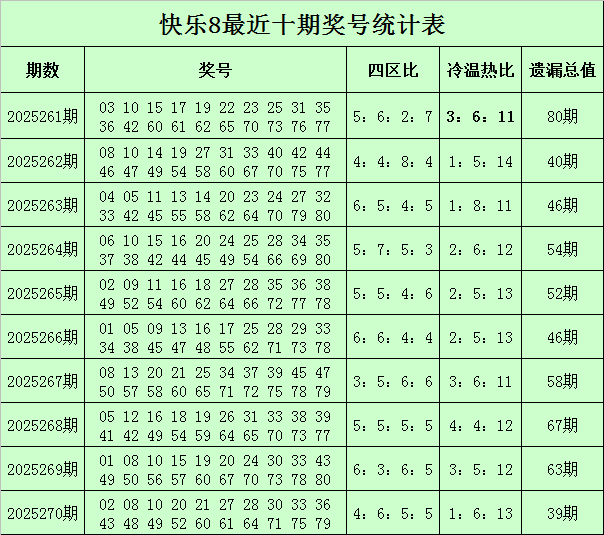 福彩快乐8第2025270期开奖回顾:02 08 10 20 21 27 28 30 33 36 43 48 49 52 60 61 64 71 75 79,其中奖号四区比为4:6:5:5,冷温热码比为1:6:13,遗漏总值为39。