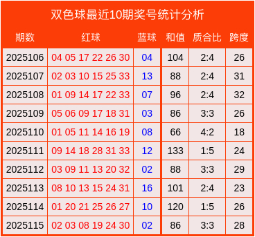 和值推荐:上一期开出的奖号和值为86,在近十期奖号和值数据中,和值为:104、88、96、86、66、133、88、101、120、86,本期预测和值为121。
