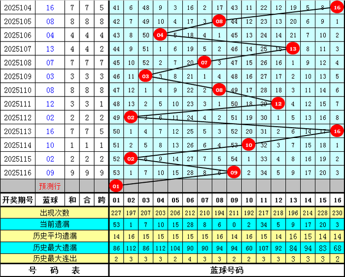 蓝球分析:上期蓝球开出09,为合数号码,本期注意质数蓝球出现,参考蓝球号码01。