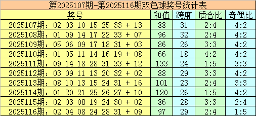 上期回顾:福彩双色球第2025116期开出奖号:02 04 08 24 28 31 + 09,红球三区比3:0:3,奇偶比为1:5。